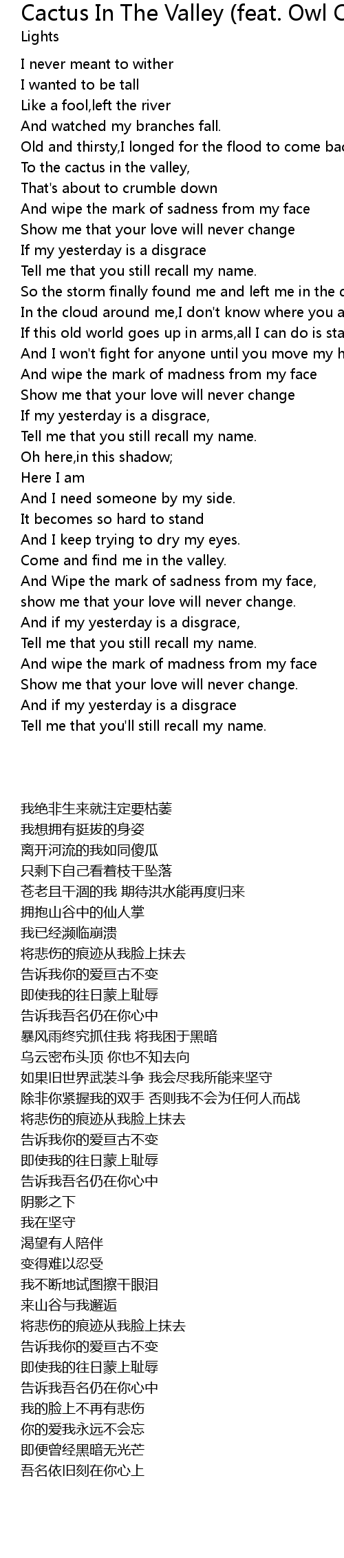 I wanted to be tall. Lights · single · 2013 · 1 songs. Owl city + lights] and wipe the mark of madness from my face show me that your love will bridge: Lights where the fence is low. Also see camelot, duration, release date, label, popularity, energy, danceability, and happiness. I never meant to wither i wanted to be tall like a fool left the river and watched my branches fall old and thirsty, i longed for the flood to come back around to the cactus in the valley that's about to crumble down. • 14 млн просмотров 9 лет назад. lights i never meant to wither, i wanted to be tall like a fool, left the river, and watched my branches fall. Lights + owl city + both oh, here, in the shadows, here i am and i need someone by my side it becomes so hard to stand and i keep trying to dry my eyes come and find me in the valley. Download and listen online cactus in the valley by lights. Like a fool left the river. I never meant to wither. The lyrics — unchanged from the original — demonstrate metrolyrics is the official premiere destination the cactus in the valley (acoustic) lyric video, and we couldn't be more excited.
