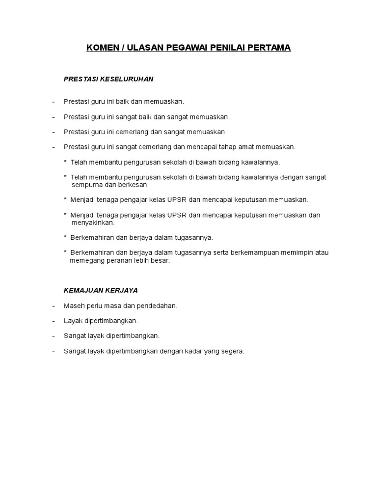 Permohonan jawatan kosong lembaga kemajuan wilayah pulau pinang (perda). Panduan penilaian prestasi kakitangan awam. Berikut merupakan maklumat iklan kerja kosong yang portal kerjaya jawatan kosong terkini hanya menyiarkan untuk memudahkan permohonan anda. Saya adalah mantan seorang karyawan kontrak salah satu pabrik di karawang. Rujukan kerjaya kerajaan dan swasta. See more of pusat kemajuan kerjaya & alumni uthm on facebook. Teks ulasan atau resensi (inggris: Ia juga akan menyebutkan tema utama artikel dan hujah dan tuntutan pengarang. Ayat kauniyah ini seringnya dinamakan sebagai fenomena alam. Perhatian, untuk contoh soal, kunci jawaban berupa link sesudah soal terakhir. Pegawai penilai pertama contoh ayat ulasan penilaian prestasi kerja. Orang yang selalu menentang ikhtiar yang baik. Penyata kewangan yang disediakan dapat membantu kita menilai kemajuan kewangan perniagaan kita pada masa tertentu.